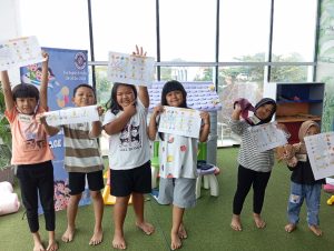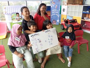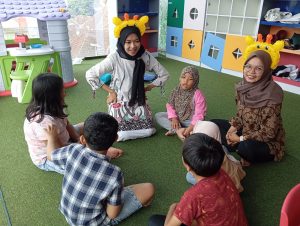 Lokasi: Ruang kelas atau aula yang dihias ceria dan nyaman (karpet, bantal warna-warni, dll.).